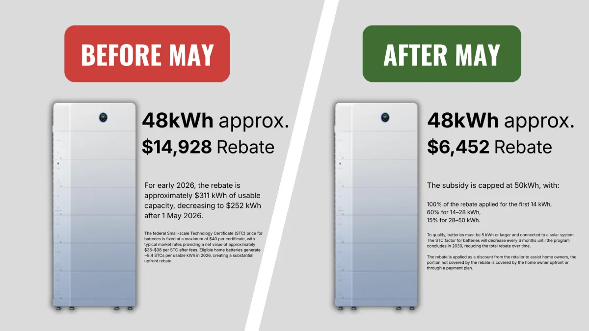 In May 2026, the current battery rebate is scheduled to reduce significantly. By installing now, you: